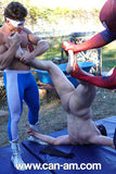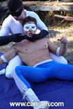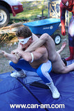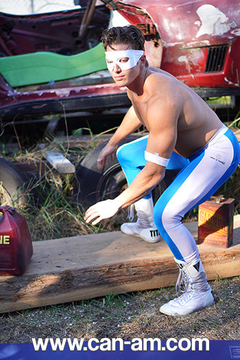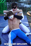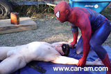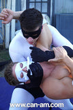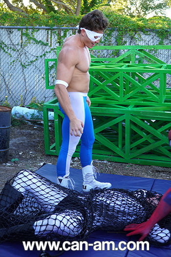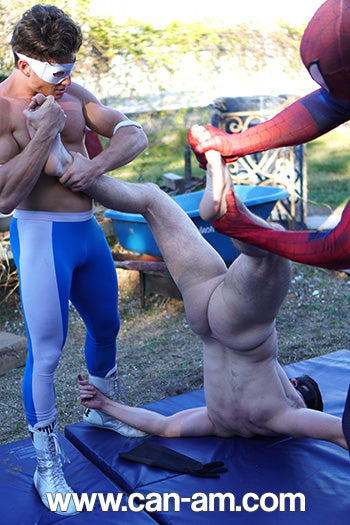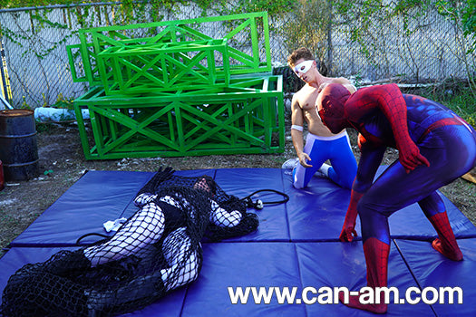Blue Jay (played by Scrappy) is patrolling a grungy junkyard, on high alert—but danger finds him first. From the shadows, Avenger (played by Max Ryder) pounces, clamping a serum-soaked rag over the hero’s mouth and draining him of his strength. With Blue Jay subdued, Avenger wastes no time indulging his villainous desires, working over the helpless hunk’s pecs and abs, admiring every inch of the spandex-clad stud as he locks in controlling holds to keep his prize in place.