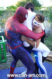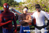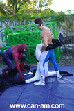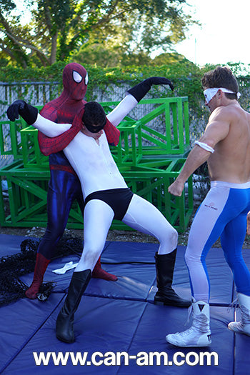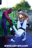 But villains get cocky—and Avenger soon finds himself trapped in a web-like cargo net. Enter Web Wonder, leaping in to rescue his fellow hero. Together, the good guys launch into a 2-on-1 payback offensive. Fists fly, bodies are beaten, and the villain is trapped beneath a wave of vengeance-fueled teamwork. Blue Jay delivers brutal gut punches while Web Wonder pins the villain down for more punishment. That's not enough. They pick Avenger up to deliver more gut punching while Web Wonder slaps on a tight full nelson.