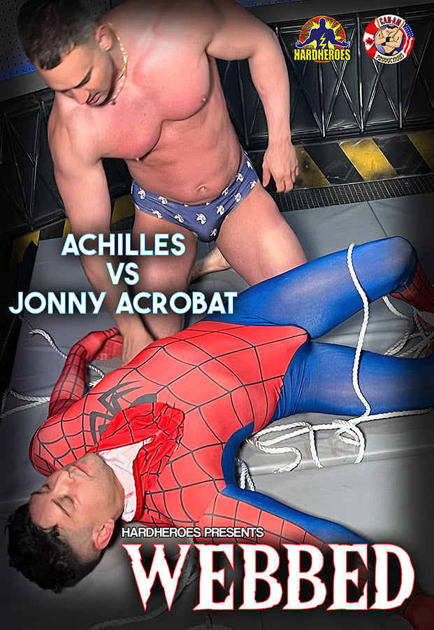 Achilles wastes no time. White rope in hand, he binds the stunned superhero—wrists, ankles, body—until Web Wonder is hogtied and helpless. The next move? Unmasking the cute crusader who protects the city. With the hero exposed, Achilles toys with him like a prize: grinding him into the mat, locking in headlocks, and spreading him wide in a dominating grapevine.