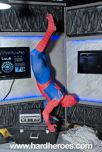 Our city’s favorite friendly superhero—Web Wonder—makes a dramatic handstand entrance into the villain’s lair, but he's not ready for what awaits. Before he can strike a pose or throw a punch, he’s ambushed by a serum-soaked rag that leaves him gasping for breath. The towering muscle villain, played by Achilles, watches as the hero stumbles, then collapses in a daze—easy prey for the thick-bodied bad boy.